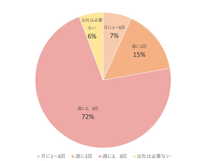 また、リモートワークでの出勤が理想的な条件であると回答した人に対して、「出社の頻度はどれくらいが望ましいですか?」と質問したところ、「週2・3回の出勤」が理想的とする回答が72%と圧倒的に多い結果となりました。