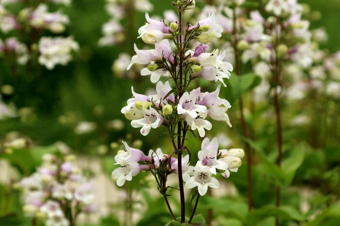 初夏から夏にかけて釣鐘状のカワイイ花を咲かせるペンステモン。なかでもハスカーレッドという品種は、スラリと伸びた銅色の茎に、白地に桜色がかった爽やかな花が咲きます。美しい銅葉も楽しめますよ。
