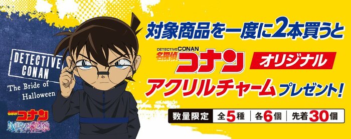 対象のソフトドリンクを一度に2本(組合せ自由)買うと名探偵コナンオリジナルアクリルチャームが1個もらえます。