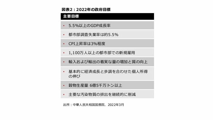 - 全国人民代表大会は2022年の政策計画を策定した。経済目標も同じく設定されている。