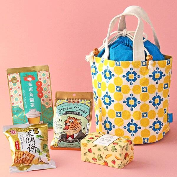 台湾の昔ながらの家屋で見かけるレトロなタイルのデザインをイメージしたオリジナルバッグです。中には本場台湾のおいしいお菓子やお茶などが入っています。バッグの上部は巾着になっているので便利に使えます。『台湾レトロタイル柄バッグ』は赤と青の2色展開。。オンラインストアでは各色おひとつずつ購入することができます。
