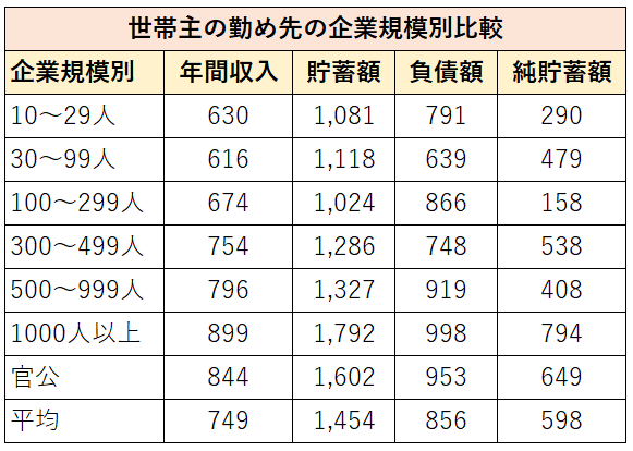 勤め先の企業規模別の負債現在高は以下の通りです。