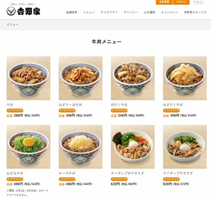 最初に登場するのは、吉野家で最もベーショック、かつ最強選手ともいえる「牛丼」。公式ホームページのメニューでは以下のように紹介されています。
