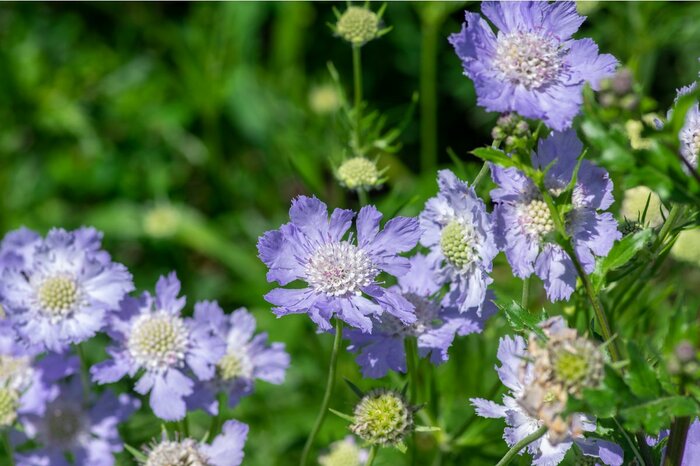野趣あふれる繊細な花姿が美しいスカビオサ。四季咲きや春咲き、秋咲きなど様々な品種があり、ほぼ一年中楽しめる花です。淡い紫、みず色の定番タイプが初夏の空によく映えるでしょう。