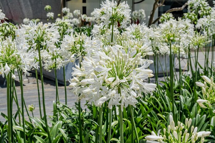すらっと長く伸びる茎と花火のように広がる花が印象的なアガパンサス。白や薄い紫の花が涼しげな色合いです。植えっぱなしで育つほど強健な性質で、初心者も安心して育てられる花です。