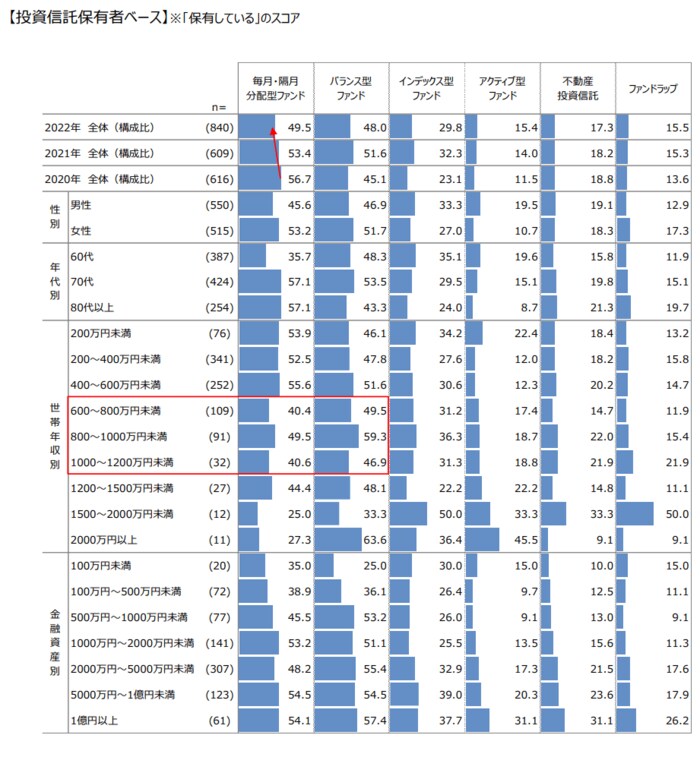 世帯年収別でみると、600万円未満では「毎月・隔月分配型ファンド」の保有が最も高いですが、 600万円以上では「バランス型ファンド」の保有率が最も高いという特徴があります。