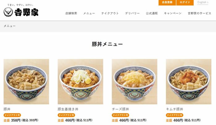 2022年4月現在、吉野家の公式メニューには、以下のどんぶりメニューが掲載されています。