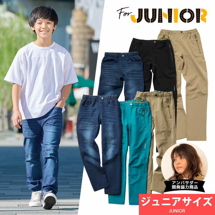 そんな方たちに一度試していただきたいのが、「ジュニアクライミングパンツ」。どんな洋服にも合わせやすいデザインですが、軽量で動きやすい仕様になっています。インディゴ以外は伸縮率130%なので、足を上げるのもスムーズです。
