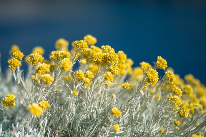 カレーの香りがする、ユニークなハーブのカレープラント。初夏から秋にかけて咲く黄色の小花、シルバーカラーの茎と葉、いずれも観賞価値が高く、乾燥させればポプリやドライフラワーでも楽しめます。