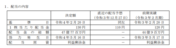 しまむらの2022年2月期の中間配当は110円、期末配当は130円でした。