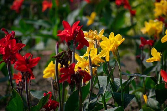 大きくボリュームのある花を咲かせ、花壇の主役にもなるカンナ。色鮮やかでエネルギッシュに咲く姿は夏の花壇にピッタリ。初夏に咲き始めて夏が終わるまで、猛暑にも負けずに咲き続けます。開花期は6~10月頃まで。
