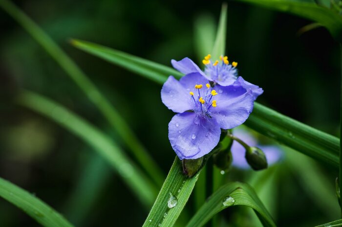 キレイな紫色の花びらが素朴で可愛らしいムラサキツユクサ。たくさんの種類があり、花の色や形がそれぞれ異なります。梅雨の時期が開花期なので、雨の日の方が元気に咲く珍しい花です。開花期は5~7月まで。
