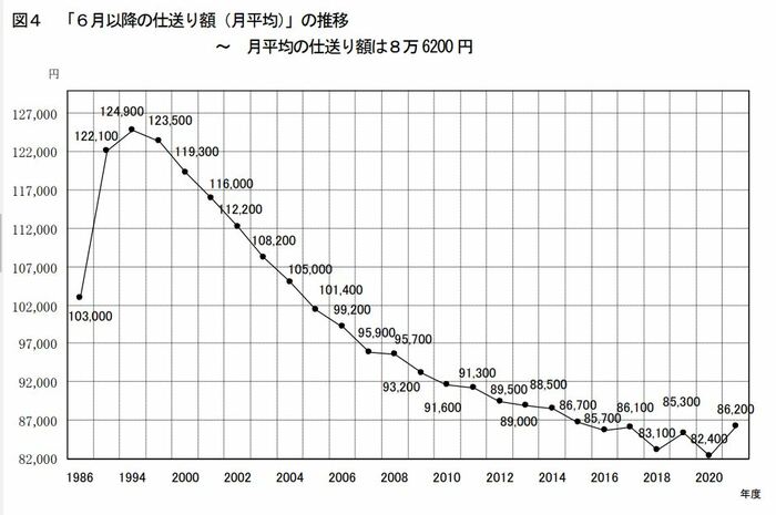 実は1994年の平均は12万4900円。なんと27年前より3万8700円、31%も減少しているのです。