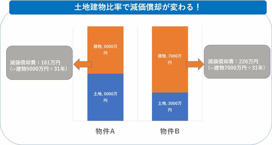 物件A・BはどちらもRC造、築20年、総額1億円ですが、土地建物比率が異なります。