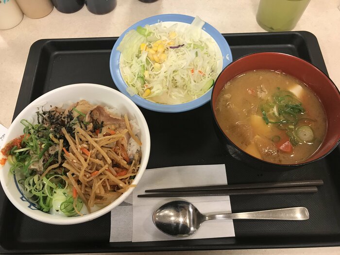 店内で食べる場合はみそ汁がついてきます。今回は、生野菜セットをオーダー。気合を入れて、みそ汁を豚汁にアップグレード(190円)してみました。