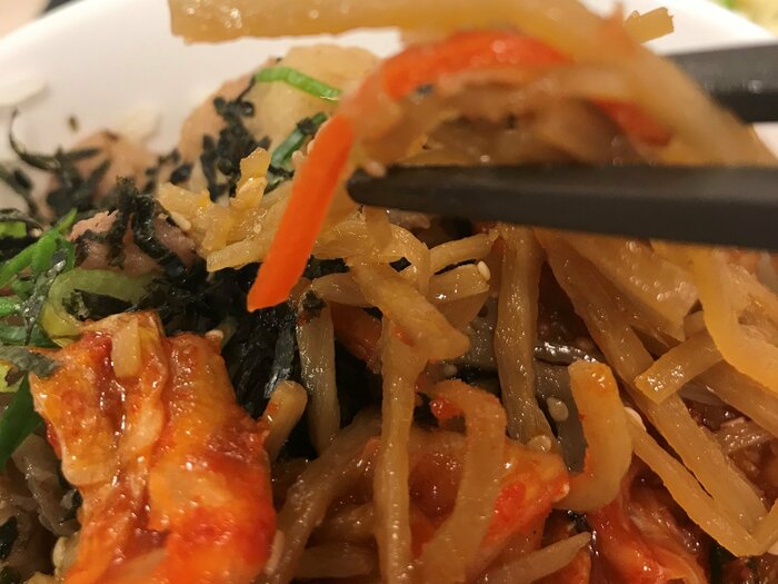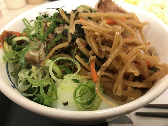 「牛ビビン丼」を改めてアップで見てみると、ヘルシー感が全面に出ていますね。でもお肉はしっかりとご飯の上に敷き詰められていますのでご安心あれ。
