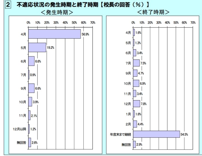 以前の調査にはなりますが、2009年7月13日~17日(金)までに校長1313名 、教諭1313名 に行われた「東京都公立小・中学校における第1学年の児童・生徒の学校生活への適応状況にかかわる実態調査について」の「公立小学校第1学年の児童の実態調査」では、不適応状況の発生時期と終了時期が公表されています。