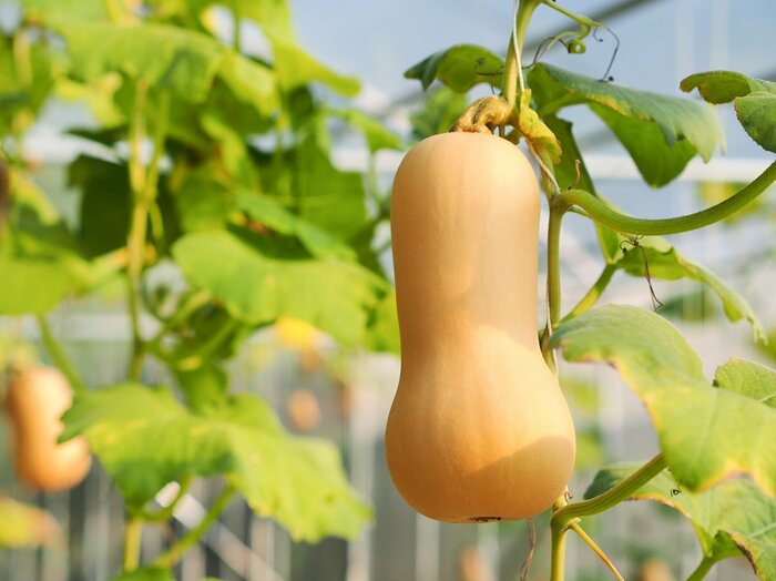 バターナッツカボチャは一般的なカボチャに比べて細長く、ひょうたんに似た形と色が特徴的。個性的な見た目がカワイイですね。