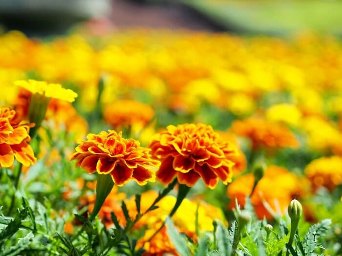 春から晩秋まで、オレンジやイエローの鮮やかな花を咲かせるマリーゴールド。華やかな雰囲気で、一重や八重、グラデーションのある花弁など、さまざまな種類があります。