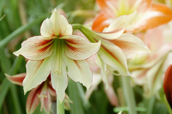 アマリリスはまっすぐ伸びた太い茎に咲く大きな花が特徴。凛とした花姿にインパクトがあります。6月までが開花期で、初夏に花を楽しめます。秋に花が咲く品種も。