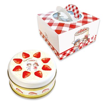 ケーキをイメージした化粧缶の中には、不二家の人気商品、ミルキーを詰めています。洋菓子店らしい持ち手付きのミニケーキ箱に入ったホールケーキ缶は、プチギフトにもおすすめのかわいさです。箱にはショートケーキ発売100周年ロゴ入り。記念品としても保管しておきたくなるアイテムですね。
