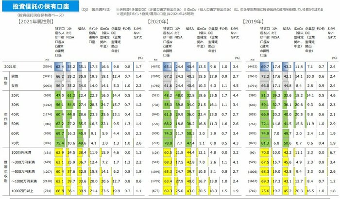 また、 「特定口座もしくは一般口座など通常の課税口座」 「NISA」は高齢層ほど保有率が増加傾向にあり、「つみたてNISA」は若年層ほど保有率が高くなっています。