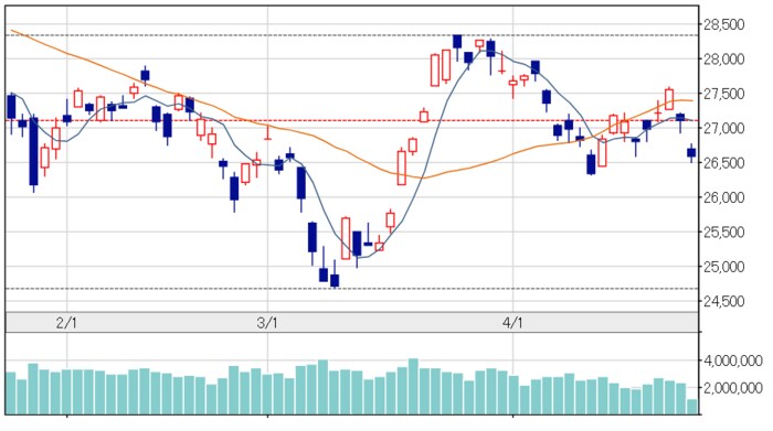 ただし、心理的な節目となる2万7000円付近では押し目買いも入りやすく、終値ベースでも2万7000円台を維持しました。