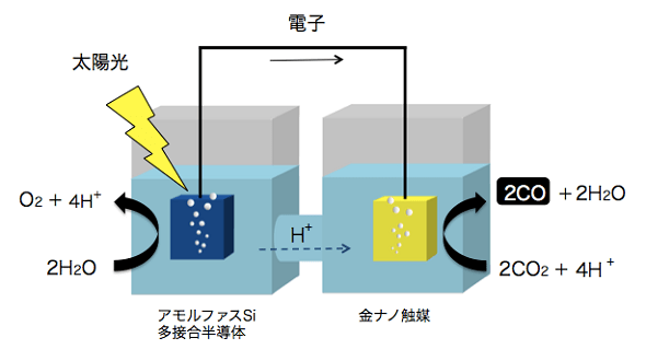 東芝が着目したのは、幅広い太陽光スペクトルを吸収できるアモルファスSi系多接合半導体光電極と、ナノサイズの構造制御技術を適用した金ナノ触媒電極である。同社は、太陽光を吸収して水を電気分解するセルに多接合半導体電極、CO2を還元するセルに金ナノ触媒を配置した2セル構造の装置を試作した。