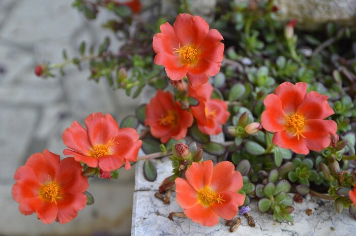 ポーチュラカは赤や黄、ピンクなどビビッドな暖色系の花を咲かせる一年草。ほふくしながら横に広がるため、グランドカバーに最適です。