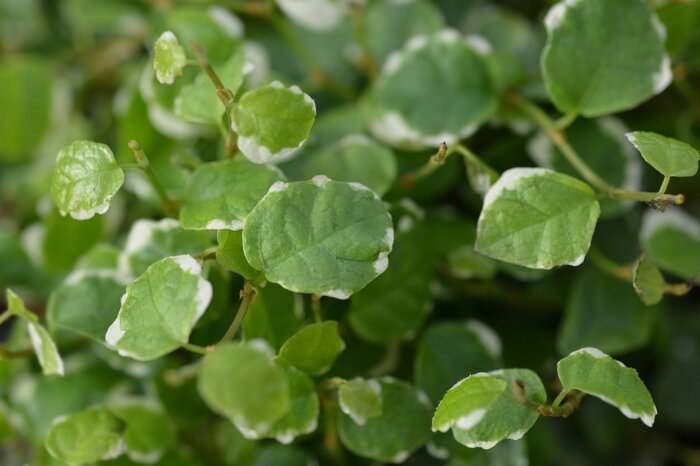 濃い緑の地に、白い縁取りのように斑が入る常緑つる性植物。枝から気根を伸ばし、這うように広がっていきます。ミントのような爽やかさで初夏の寄せ植えにもピッタリです。※参考価格:300~600円前後(3号ポット苗)