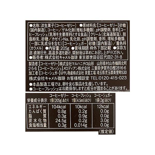 ・原材料:(コーヒーゼリー)砂糖(国内製造)、コーヒー/ゲル化剤(増粘多糖類)、pH調整剤、香料(コーヒーフレッシュ(乳等を主要原料とする食品))クリーム(北海道製造)、脱脂粉乳、砂糖/カゼインNa、乳化剤、pH調整剤、香料、増粘多糖類(一部に乳成分を含む)(コーヒーシュガー)砂糖(国内製造)/着色料(カラメル)