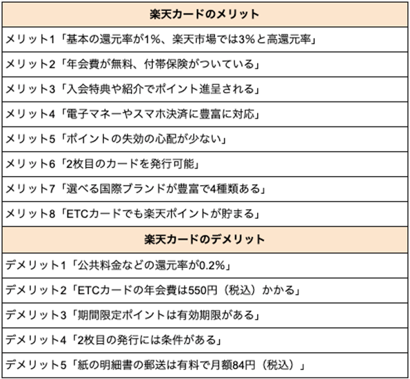 楽天カードの8つのメリットと5つのデメリットを徹底解説 2022.05.03 18:30 公開 執筆者藤原 悠喜 copy URL 目次[開く] 1. 楽天カードのメリット 1.1 メリット1「基本の還元率が1%、楽天市場では3%と高還元率」 1.2 メリット2「年会費が無料、付帯保険がついている」 1.3 メリット3「入会特典や紹介でポイント進呈される」 1.4 メリット4「電子マネーやスマホ決済に豊富に対応」 1.5 メリット5「ポイントの失効の心配が少ない」 1.6 メリット6「2枚目のカードを発行可能」 1.7 メリット7「選べる国際ブランドが豊富で4種類ある」 1.8 メリット8「ETCカードでも楽天ポイントが貯まる」 2. 楽天カードのデメリット 2.1 デメリット1「公共料金などの還元率が0.2%と低い」 2.2 デメリット2「ETCカードの年会費は550円(税込)」 2.3 デメリット3「期間限定ポイントは有効期限が設けられている」 2.4 デメリット4「2枚目の発行には条件アリ」 2.5 デメリット5「紙の明細書の郵送は有料で月額84円(税込)かかる」 3. まとめにかえて 参考資料 3. まとめにかえて いかがでしたでしょうか。 今回は楽天カードのメリットとデメリットを紹介してきました。 楽天カードは楽天経済圏の方や楽天市場の利用頻度の高い方におすすめのクレジットカードになっています。 少しでも参考になれば幸いです。 すべての画像を見る(1枚) 参考資料 【公式】楽天カード 藤原 悠喜 < 1 2 3 4 執筆者 藤原 悠喜 株式会社モニクルリサーチ 編集者/クレジットカード・住宅ローン・FX担当 専門学校を卒業後、複数のIT企業にて、Webメディアの立ち上げや運営に従事。SEOディレクターや広告運用など、Webマーケティング歴10年。現在は、クレジットカードのジャンルを中心にコンテンツの企画立案や執筆を行っている。これまで携わったクレジットカードのコンテンツは500以上。自身が使用するメインやサブのクレジットカードを定期的に入れ替え、サービス内容や使い勝手をユーザー視点で検証している。(2023年11月20日更新) 注目コンテンツ 【LIMOで懸賞】新しいプレゼントが続々登場中!最新情報はこちらから[PR] 年齢入れて5秒で見積もり!人気の医療保険ランキングをチェック[PR] 持病があっても入りやすい医療保険。人気の保険はこの保険![PR]