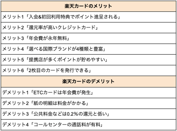 【楽天カード】6つのメリットと忘れてはいけない4つのデメリットを徹底解説 2022.05.09 18:30 公開 執筆者藤原 悠喜 copy URL 目次[開く] 1. 楽天カードのメリット 1.1 メリット1「入会&初回利用特典でポイント進呈される」 1.2 メリット2「還元率が高いクレジットカード」 1.3 メリット3「年会費が永年無料」 1.4 メリット4「選べる国際ブランドが4種類と豊富」 1.5 メリット5「提携店が多くポイントが貯めやすい」 1.6 メリット6「2枚目のカードを発行できる」 2. 楽天カードのデメリット 2.1 デメリット1「ETCカードは年会費が発生」 2.2 デメリット2「紙の明細は料金がかかる」 2.3 デメリット3「公共料金などは0.2%の還元と低い」 2.4 デメリット4「コールセンターの通話料が有料」 3. まとめにかえて 参考資料 3. まとめにかえて いかがでしたでしょうか。 楽天経済圏の方や楽天市場の利用頻度が高い方に楽天カードはおすすめです。 自分のライフスタイルに合ったクレジットカード選びをしてみてはいかがでしょうか。 少しでも参考になれば幸いです。 すべての画像を見る(1枚) 参考資料 【公式】楽天カード 藤原 悠喜 < 1 2 3 執筆者 藤原 悠喜 株式会社モニクルリサーチ 編集者/クレジットカード・住宅ローン・FX担当 専門学校を卒業後、複数のIT企業にて、Webメディアの立ち上げや運営に従事。SEOディレクターや広告運用など、Webマーケティング歴10年。現在は、クレジットカードのジャンルを中心にコンテンツの企画立案や執筆を行っている。これまで携わったクレジットカードのコンテンツは500以上。自身が使用するメインやサブのクレジットカードを定期的に入れ替え、サービス内容や使い勝手をユーザー視点で検証している。(2023年11月20日更新) 注目コンテンツ 女性特有のがんは40代から増える?女性向け医療保険で備える[PR] 30秒でオススメの医療保険の特約がわかる!保障で悩むならまずは診断[PR] 持病があっても入りやすい医療保険。人気の保険はこの保険![PR] あわせて読みたい