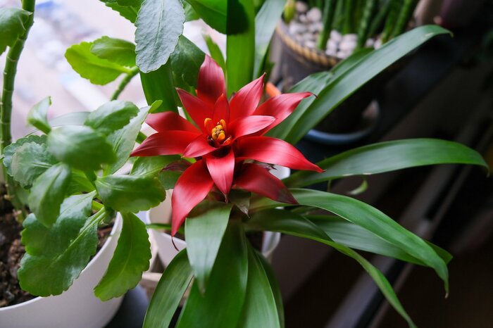 グズマニアは噴水のように外に向かって開く葉と、先端に咲く色鮮やかな花が特徴的な観葉植物。赤や黄色などの鮮やかな花はエキゾチックな雰囲気です。