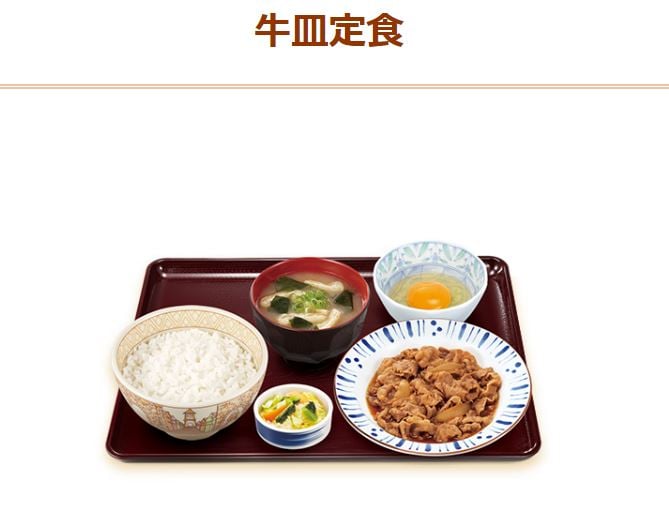 すき家の牛皿定食は、メインの牛皿の他に、おしんこ、たまご、みそ汁、ごはんがついた定食セットです。