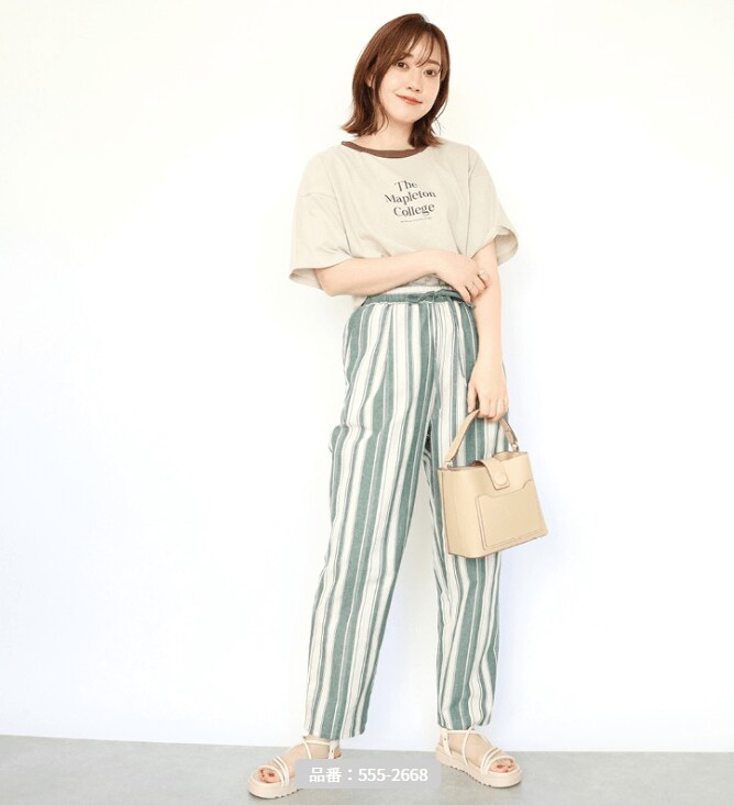 トレンドのグリーンストライプ柄のテーパードパンツが登場。