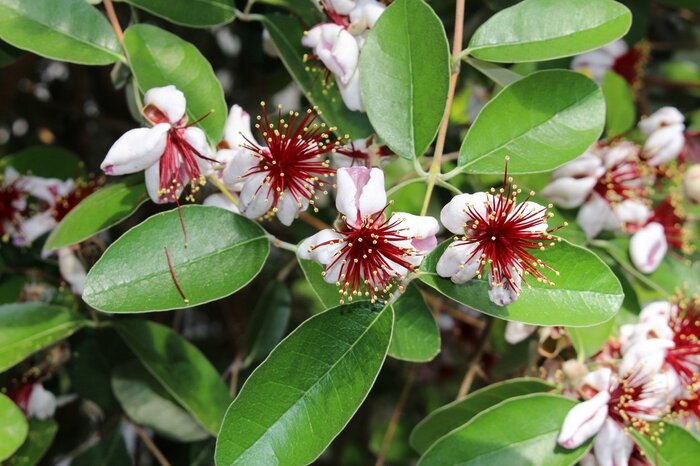 春から初夏にかけて咲く南国風の花と、濃いグリーンの葉がオシャレなフェイジョア。常緑果樹ですが、寒冷地では一時的に葉が落ちることもあります。