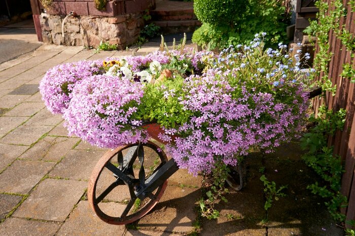 アンティークレンガを並べたり、レトロなブリキ缶を鉢替わりにしたりするとオシャレです。