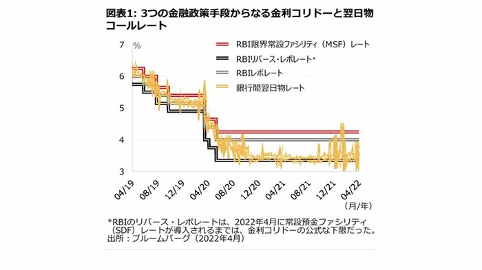 RBIがこれらの資金供給・吸収オプションを用意しているため、銀行間翌日物貸出市場金利(その代表は加重平均コールレート)は、上述の3つの金融政策手段により形成される金利コリドーの範囲内に概ねとどまることが予想される(図表1)。