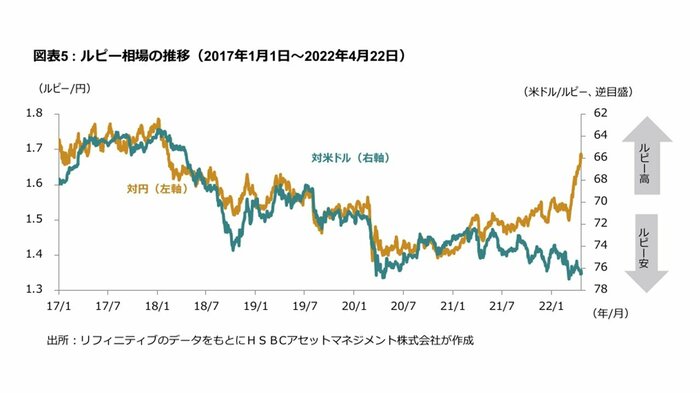 インドルピーは2021年9月以降は、米国の金融政策の正常化などから米ドル高・円安が進行する中で、対米ドルでは下落、対円では上昇している(4月22日現在)。