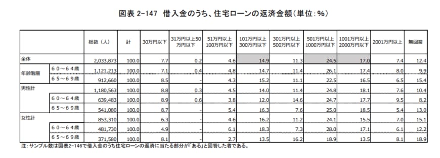 少し前の調査にはなりますが、独立行政法人労働政策研究・研修機構が60〜69歳5000人に行った「調査シリーズNo.199『60代の雇用・生活調査』(2020年3月公表)」より、住宅ローンの残高を確認します。