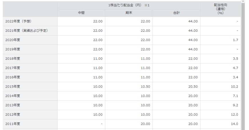 - 2022年3月期の中間配当と期末配当:22円/22円