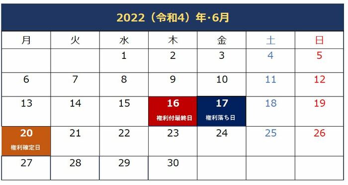 たとえば、6月20日が決算の会社であれば、権利確定日と権利付最終日は以下のようになります。