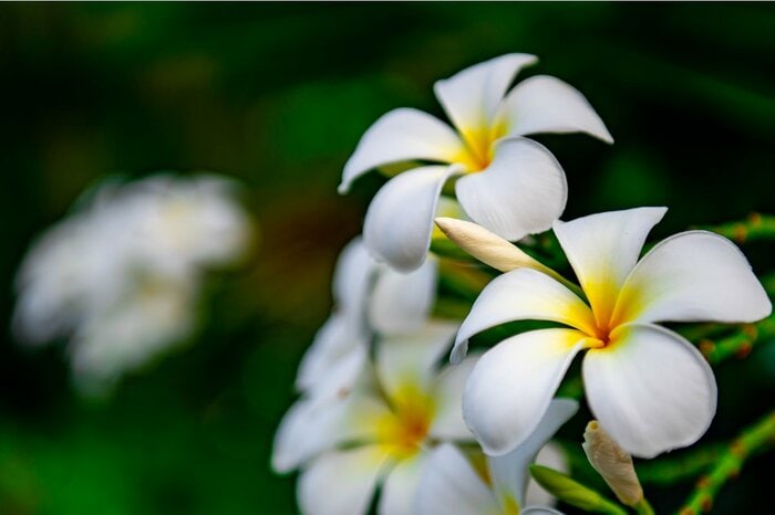 ハワイを代表する花のひとつ、プルメリア。初夏から秋にかけて白やピンク、赤い花を咲かせます。