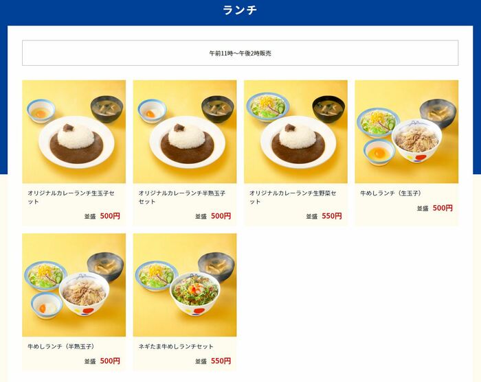 松屋のランチセットの販売は、午前11時から午後2時までの時間限定。2022年5月現在、下記の6種類のラインナップで展開中です。