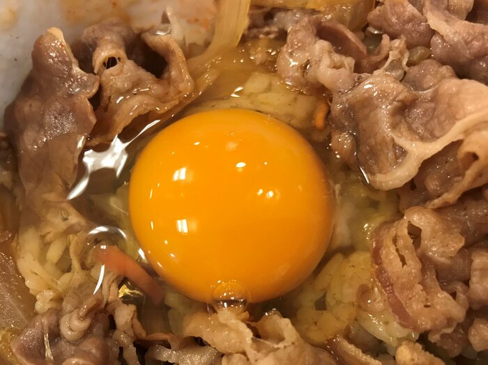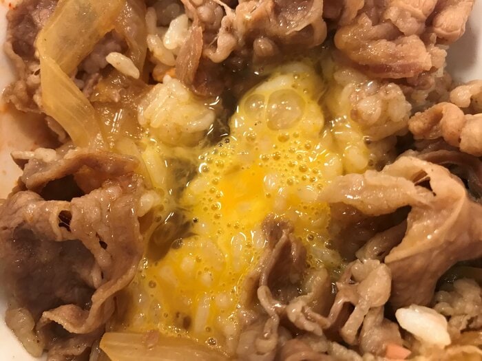 次は生玉子を、牛めしの中央に割り入れます。このとき、牛肉の中央を少しへこませて「くぼみ」を作ってあげましょう。