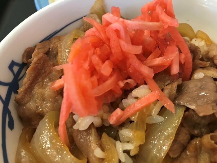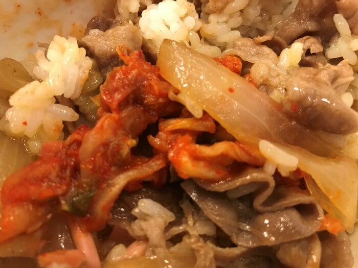 玉子をかけた後のまろやかな牛めしと好相性なのがキムチ!辛さと歯ごたえで、牛めし全体を引き締めてくれます。
