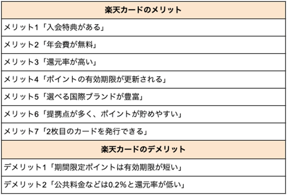 楽天カードはポイ活に必須、メリット7つとデメリット2つを徹底解説 2022.05.12 18:30 公開 執筆者藤原 悠喜 copy URL 目次[開く] 1. 楽天カードのメリット 1.1 メリット1「入会特典がある」 1.2 メリット2「年会費が無料」 1.3 メリット3「還元率が高い」 1.4 メリット4「ポイントの有効期限が更新される」 1.5 メリット5「選べる国際ブランドが豊富」 1.6 メリット6「提携店が多く、ポイントが貯めやすい」 1.7 メリット7「2枚目のカードを発行できる」 2. 楽天カードのデメリット 2.1 デメリット1「期間限定ポイントは有効期限が短い」 2.2 デメリット2「公共料金などは0.2%と還元率が低い」 3. まとめにかえて 参考資料 3. まとめにかえて いかがでしたでしょうか。 今回は楽天カードに着目してメリットとデメリットを紹介しました。 楽天カードは還元率などを考えてもポイントを貯めやすいクレジットカードとなっています。 少しでも参考になれば幸いです。 すべての画像を見る(1枚) 参考資料 【公式】楽天カード 藤原 悠喜 < 1 2 3 執筆者 藤原 悠喜 株式会社モニクルリサーチ 編集者/クレジットカード・住宅ローン・FX担当 専門学校を卒業後、複数のIT企業にて、Webメディアの立ち上げや運営に従事。SEOディレクターや広告運用など、Webマーケティング歴10年。現在は、クレジットカードのジャンルを中心にコンテンツの企画立案や執筆を行っている。これまで携わったクレジットカードのコンテンツは500以上。自身が使用するメインやサブのクレジットカードを定期的に入れ替え、サービス内容や使い勝手をユーザー視点で検証している。(2023年11月20日更新) 注目コンテンツ 【キャラつくAI】プロフィールをもとにAIがあなたをイメージして絵を描きます![PR] 三大疾病に備える!人気の三大疾病保険を比較[PR] 【LIMOで懸賞】新しいプレゼントが続々登場中!最新情報はこちらから[PR]
