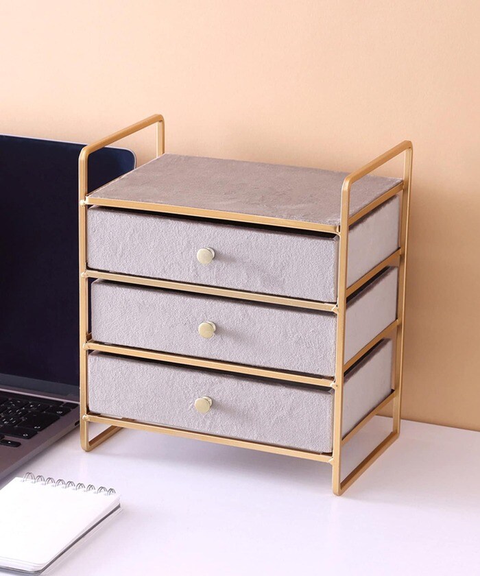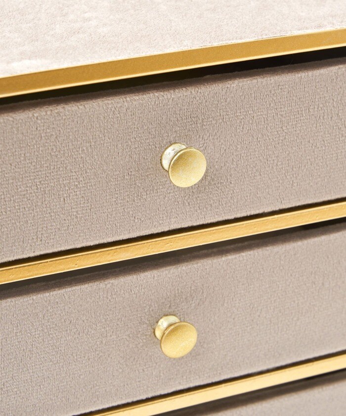 WEB限定の高級感のあるデザインのミニチェストです。アクセサリーや腕時計など小物収納にぴったり。起毛感のある生地を使用しているので、中にいれた小物を傷つけにくい仕様となっています。シンプルでどんなお部屋にも馴染みやすいカラーリングが特徴です。