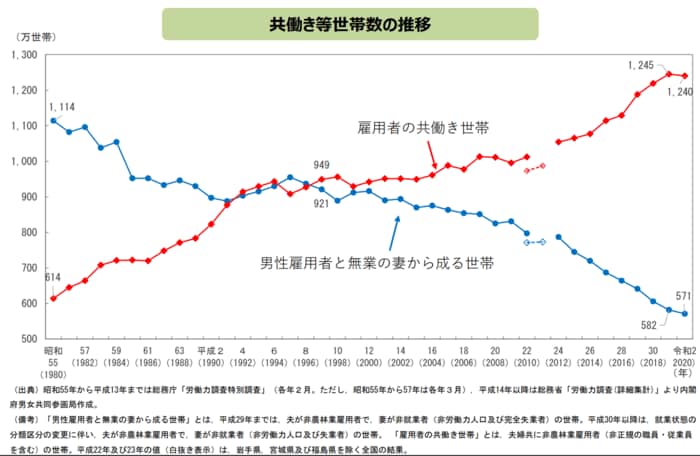 1980年には1114万世帯だった専業主婦世帯は、1990年代後半に共働き世帯と同程度の921万世帯になり、2020年には571万世帯まで減少しています。